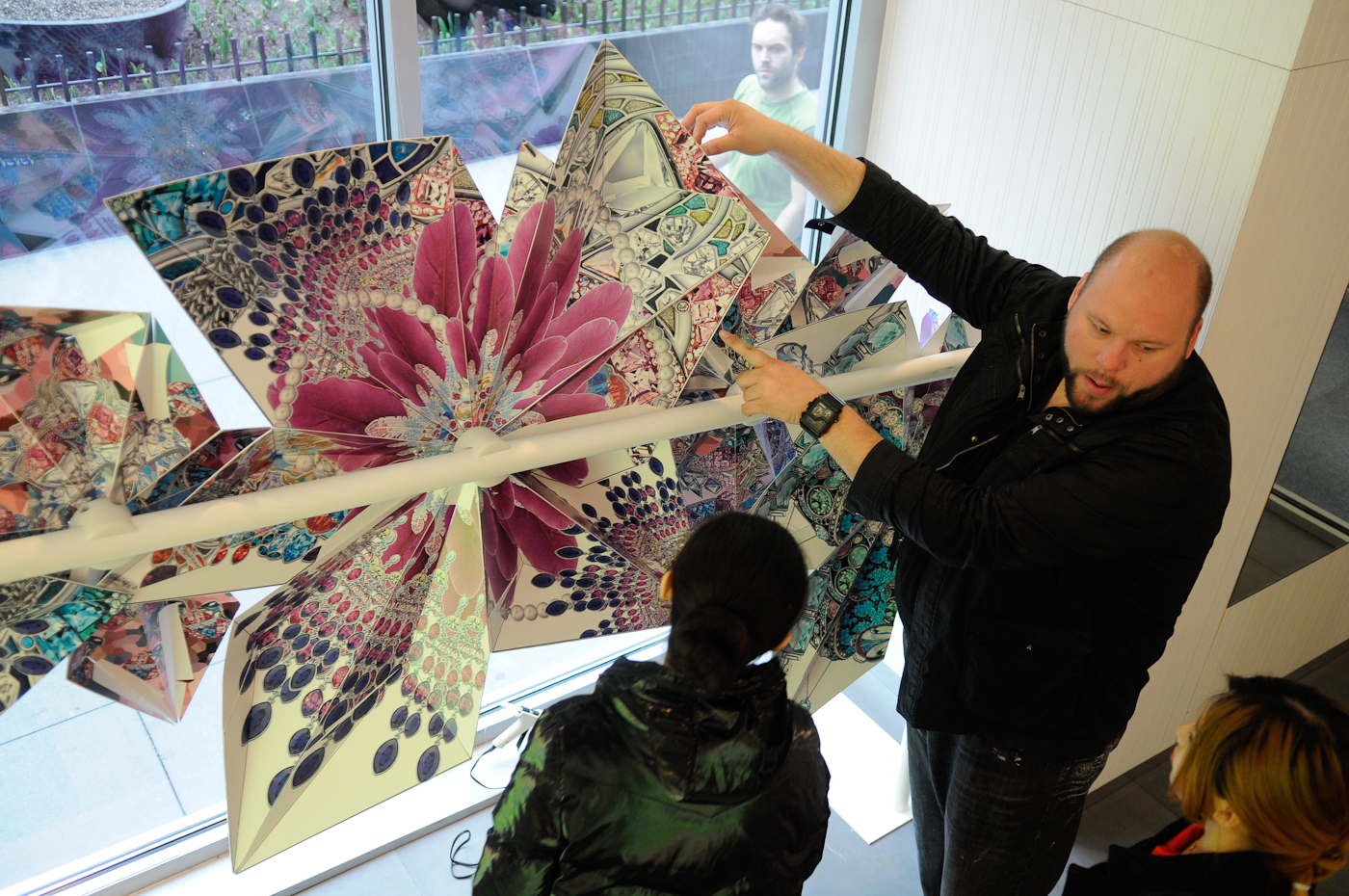 - Joe Leamanczyk discusses the window display with his fellow graduate students from SAIC’s Fashion, Body and Garment program while putting the display together at Swarovski’s flagship Chicago boutique. The window display, which is adorned with jewelry from Swarovski’s Tropical Paradise collection, was inspired by Swarovski’s “Passport to Sparkle” campaign and created by the students in honor of kicking off Fashion 2013.