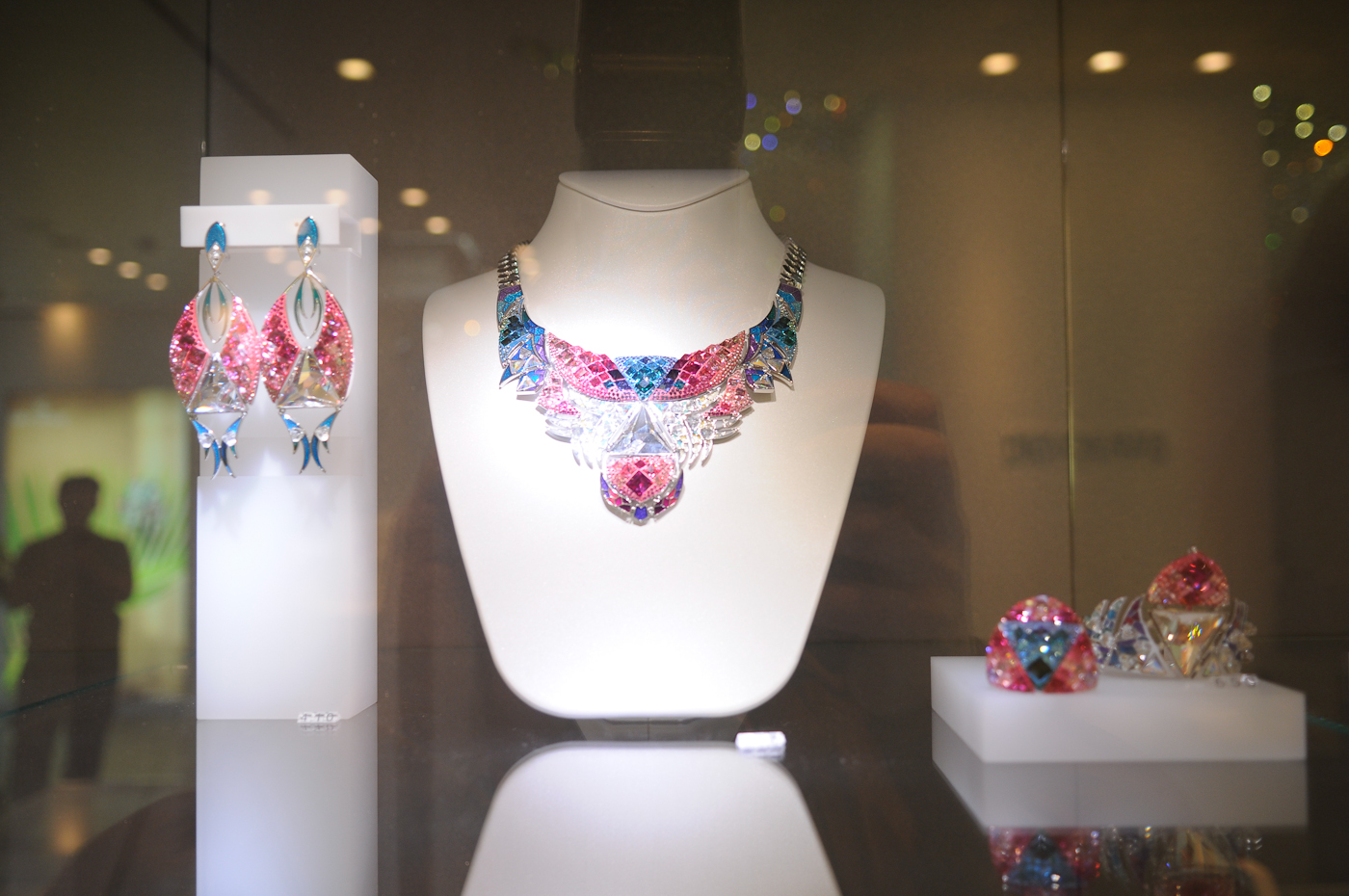 - Cher Jiang puts up one of the pieces of the window installation, sponsored by Swarovski in honor of Fashion 2013/THE WALK 2013 and located in the boutique windows of the Michigan Ave location