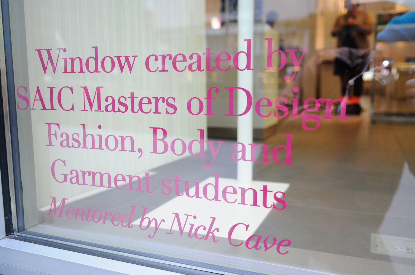 - Misha Lee and Cher Jiang put the finishing touches on the Swarovski window display, created by SAIC Fashion, Body and Garment graduate students