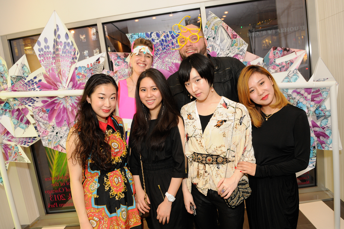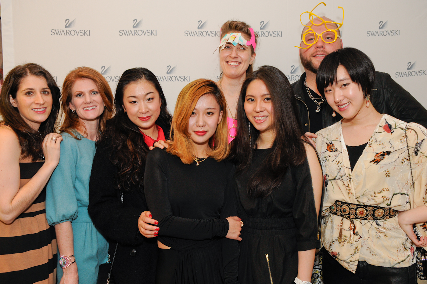 - SAIC graduate students from the Fashion, Body and Garment program at SAIC, who created the window display now available for viewing at Swarovski’s Michigan Avenue boutique, with Melissa Pastore (brown hair), Swarovski Public Relations Manager, and Jennifer Hinkle (red hair), Director/Head of Communications at Swarovski