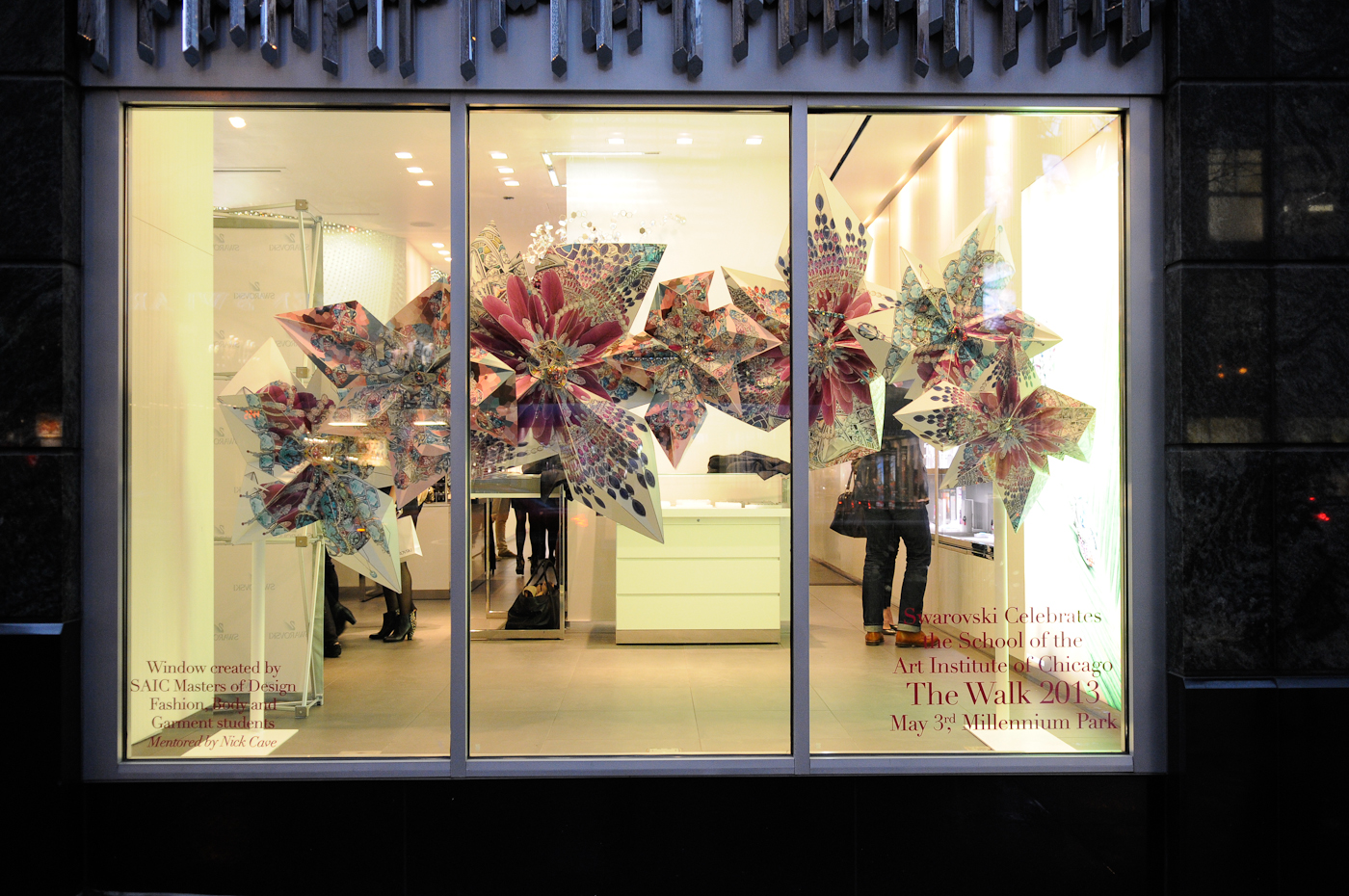Swarovski brought a lot of sparkle to a recent rainy Monday in Chicago. Partnering with the School of the Art Institute (SAIC) on their 79th annual fashion show titled The Walk, the iconic jewelry company will provide jewels for three juniors to complete their looks for the show on May 3rd. To celebrate, Swarovski’s flagship boutique (540 North Michigan Ave.) hosted a slew of fashionistas to get the first look at a window installation mentored by artist, and professor for the Fashion Design department at SAIC, Nick Cave in a collaboration with 13 students including Yufan Gao, Xue Jiang, Youngeun Kwun, Joseph Leamanczyk, Jieru Li, Hao Liu, Sisi Liu, Melvin Marckwardt, Fei Nie, Carmine Ro, Fu Hsueh Tsao, Lindsey Whittle and Man Yuan, from the Master of Design: Fashion, Body and Garment program, part of the Department of Fashion Design at SAIC. If you’re in Chicago, you can view the window installations until May 3, 2013. “It was inspirational to see how our students incorporated Swarovski jewelry and crystals into the design of the window installation last year, and I’m excited to work with this year’s team on creating an equally impressive piece. The commitment of sponsors, like Swarovski, challenges our emerging fashion students to use new and unusual resources, as well as offering our students enriching educational experiences,” said Cave.
