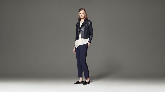 - Ruffle Tank in White, $26.99 Leather Jacket in Navy, $249.99 Tuxedo Pant in Navy/Black, $39.99 *Shoes by 3.1 Phillip Lim