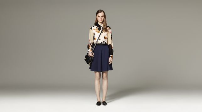 - Long-Sleeve Blouse in Floral Print, $29.99 Silky Skirt in Navy, $29.99 Mini Satchel in Black, $34.99 *Shoes by 3.1 Phillip Lim
